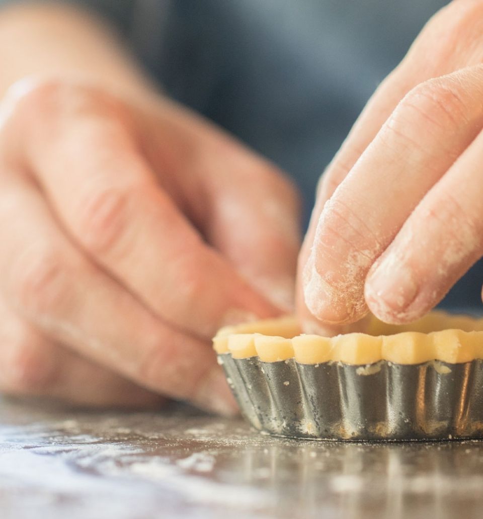 Line the prepared tart tins with the pastry and press down gently. Make sure you go right into the corners. Trim off the excess dough and refrigerate before baking.